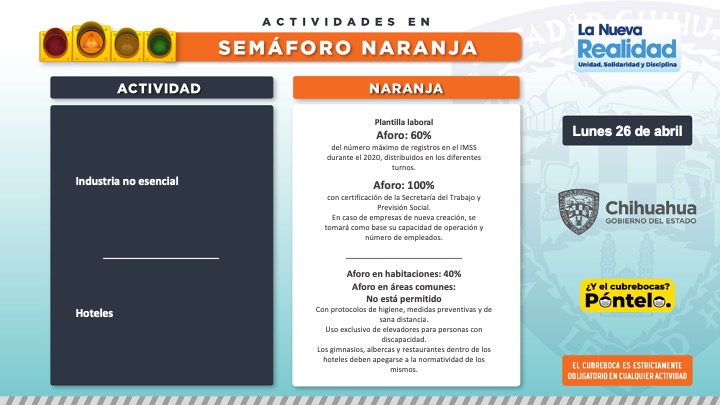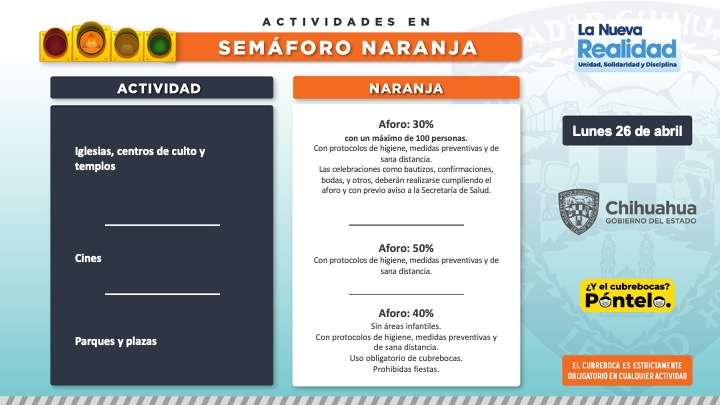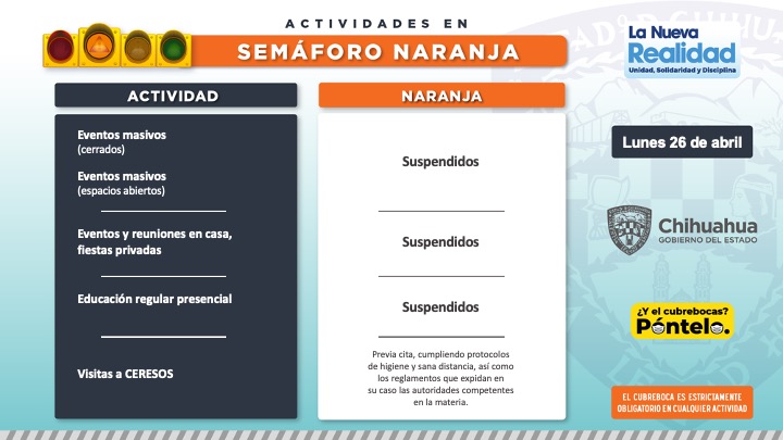 CHIHUAHUA, CHIH.- Con el fin de reducir la propagación de contagios por COVID-19, el secretario de Salud, Eduardo Fernández Herrera, anunció este domingo que la región Juárez pasará al color naranja del semáforo epidemiológico, con lo que adoptará las mismas medidas restrictivas del resto del territorio estatal.