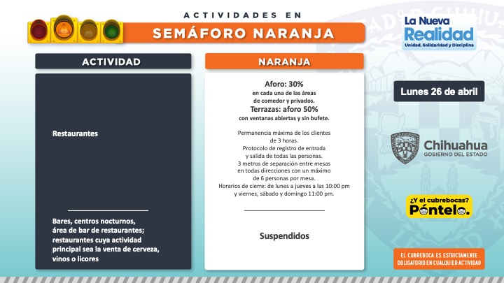 Destacó que los dos cambios más importantes del semáforo radican en la reducción del aforo de restaurantes y restaurantes-bar, los cuales podrán operar con un protocolo de registro de entrada y salida, con un aforo del 30 por ciento en el interior y de un 50 por ciento en el área de terraza.