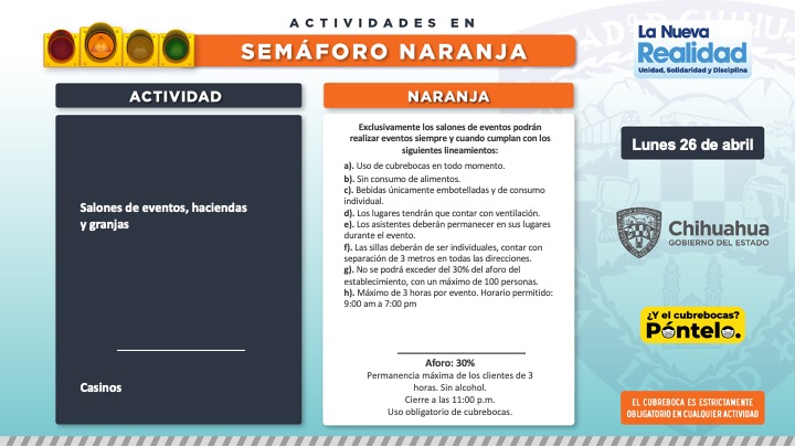 El funcionario explicó que en el caso de los salones de eventos, al ser una de las actividades más afectadas por la pandemia se permitirá su apertura, siempre y cuando no haya consumo de alimentos, y las bebidas deben ser únicamente embotelladas y de consumo individual.