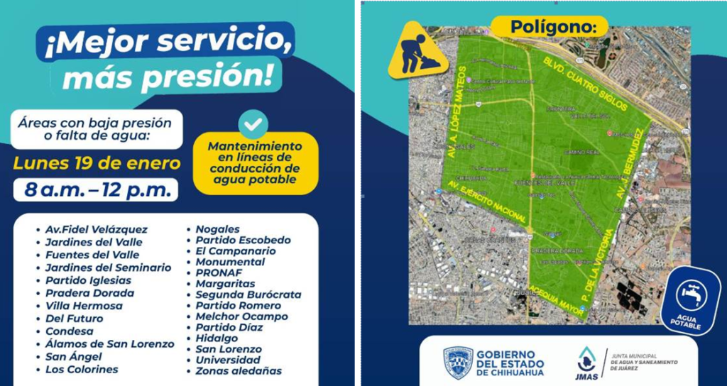 La Junta de Agua y Saneamiento de Juárez (JMAS) informa a la ciudadanía que el próximo lunes 19 de enero, en un horario de 8:00 a 12:00 horas, se llevarán a cabo trabajos de mantenimiento en las principales líneas de conducción de agua potable de la ciudad, con el objetivo de mejorar la presión y el funcionamiento del servicio.