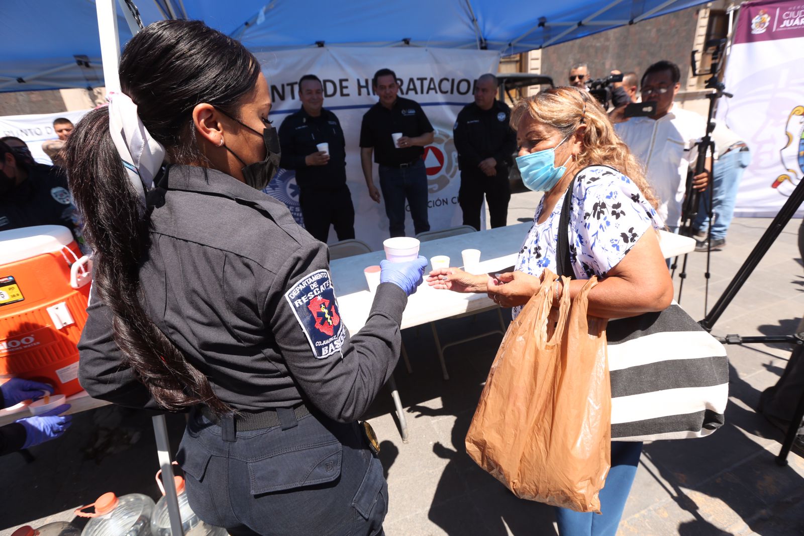 Personal de este Departamento instaló dos puntos de hidratación en el primer cuadro de la ciudad, uno en la avenida Juárez a un costado del puente internacional Pasó del Norte, así como en la Plaza de Armas, frente a la Catedral de Nuestra Señora de Guadalupe.
