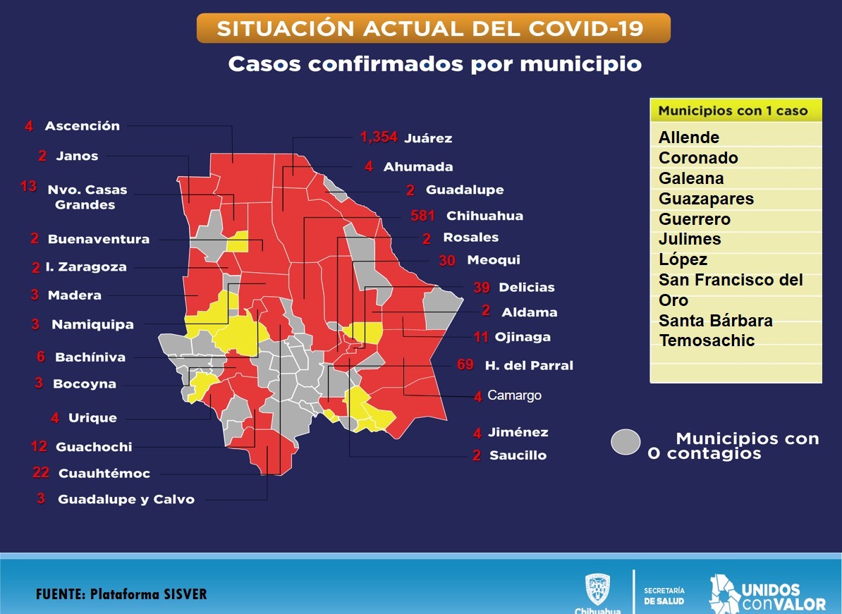 Los casos confirmados a las 19:00 horas del 3 de junio, son: 1,354 Juárez, 581 Chihuahua, 6 Bachíniva, 22 Cuauhtémoc, 11 Ojinaga, 3 Namiquipa, 30 Meoqui, 1 Julimes, 4 Camargo, 2 Saucillo, 4 Ahumada, 2 Guadalupe D.B., 12 Guachochi, 39 Delicias, 4 Ascensión, 1 Guerrero, 3 Bocoyna, 3 Madera, 69 Parral, 2 Buenaventura, 1 Temósachi, 1 Galeana, 3 Guadalupe y Calvo, 13 Nuevo Casas Grandes, 2 Rosales, 4 Jiménez, 2 Aldama, 1 Santa Bárbara, 2 Ignacio Zaragoza, 1 López, 4 Urique, 2 Janos, 1 San Francisco del Oro, 1 Guazapares, 1 Allende y 1 Coronado.