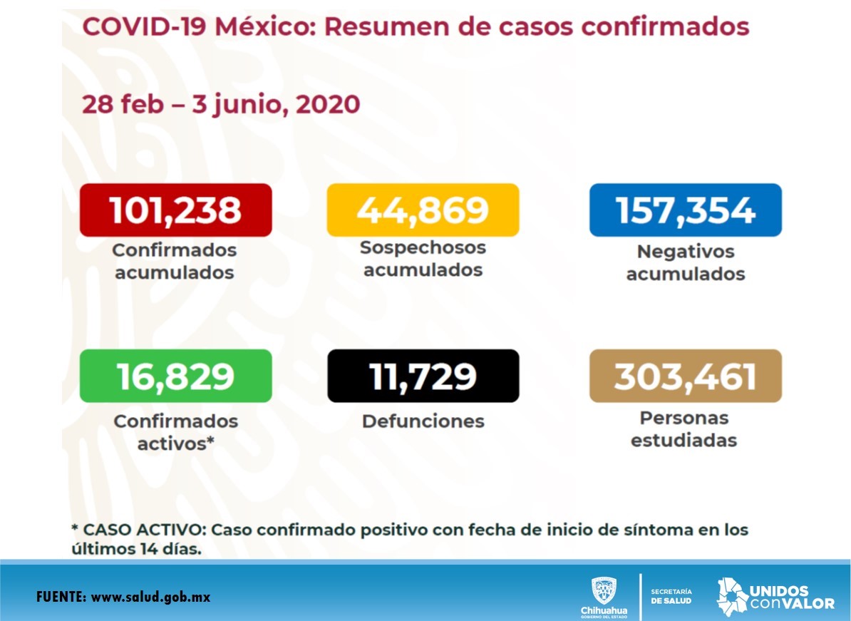En el país: 101,238 acumulados, 16,829 activos, 11,729 defunciones, 44,869 sospechosos acumulados, 153,601 negativos y 303,461 personas estudiadas.