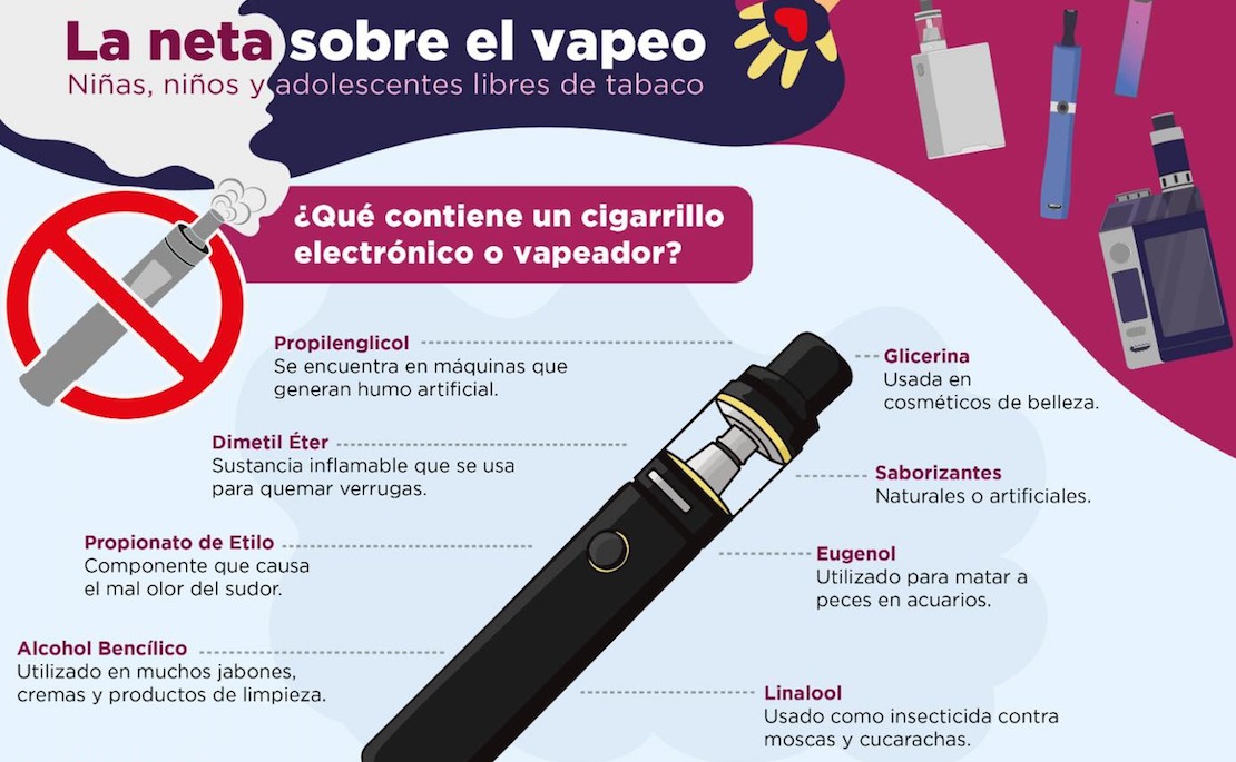 El SIPINNA señaló que el vapeador contiene propilenglicol que se encuentra en las máquinas que generan humo artificial, además dimetil éter, cuya sustancia inflamable se usa para quemar verrugas.