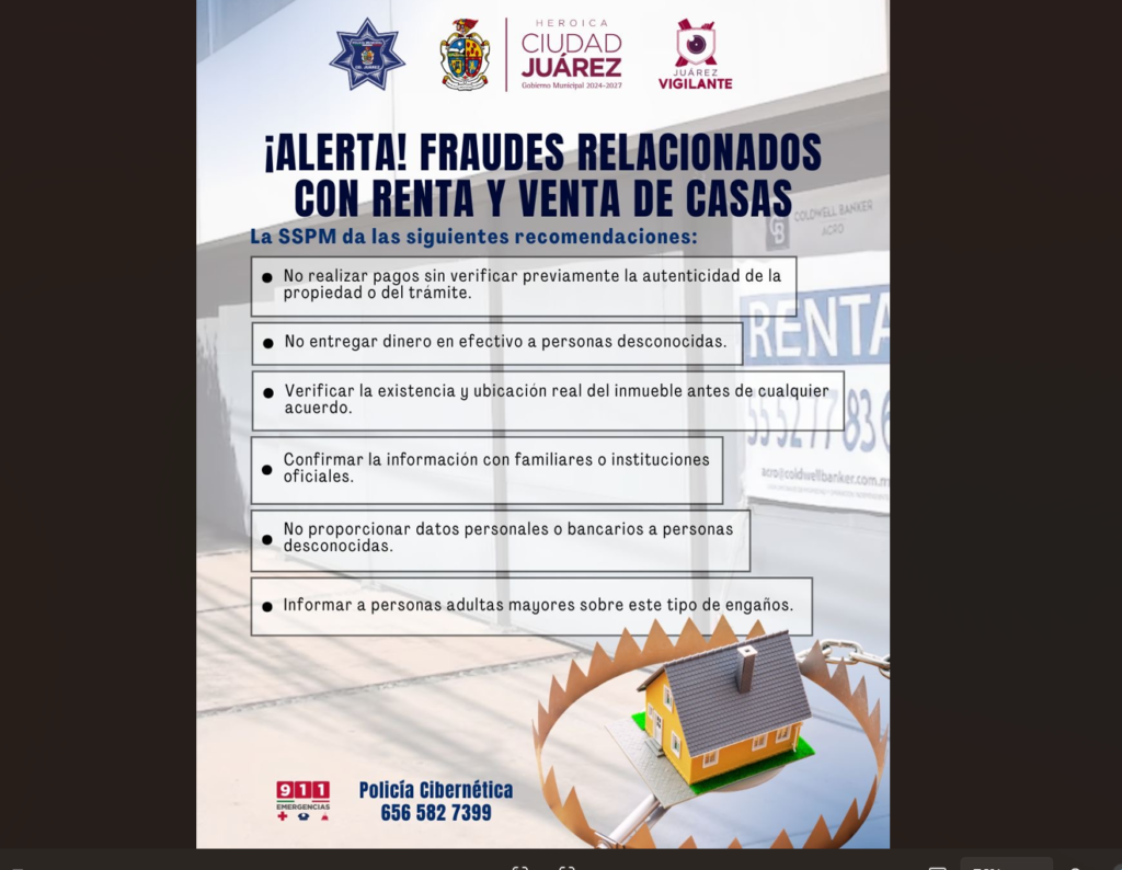 CD. JUAREZ, CHIH.- La Secretaría de Seguridad Pública Municipal, a través de la Dirección de Investigación y del Área de Delitos Cibernéticos, alerta a la ciudadanía sobre una modalidad de fraude relacionada con la supuesta renta o venta de viviendas, generada a través de anuncios digitales o físicos.