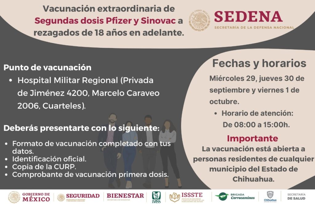 CHIHUAHUA, CHIH.- El delegado de Programas para el Desarrollo en Chihuahua, Juan Carlos Loera, anunció este día que del miércoles 29 de septiembre al viernes 1ro de octubre se estarán aplicando las segundas dosis de las vacunas Pfizer y Sinovac contra el Covid 19 a las personas mayores de 18 años de edad que hayan recibido su primera dosis y por algún motivo no pudieron completar su esquema en jornadas anteriores.