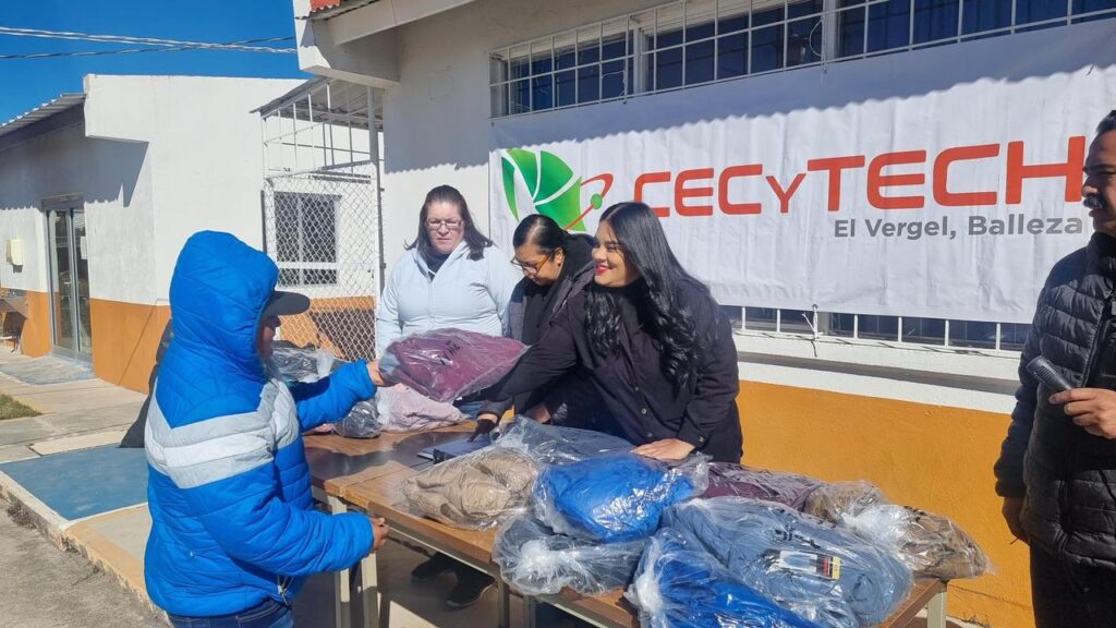 CD. JUAREZ, CHIH.- Estudiantes del Colegio de Estudios Científicos y Tecnológicos del Estado de Chihuahua (CECyTECH) plantel El Vergel, en el municipio de Balleza, fueron beneficiados con la entrega de 110 chamarras, como parte de la campaña solidaria “Juntos Sin Frío”, que encabeza el DIF Estatal.