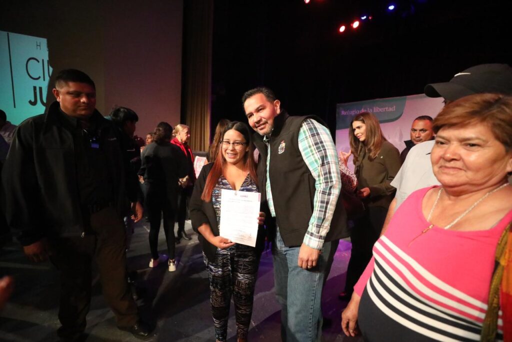 CD. JUAREZ, CHIH.- En el marco de la entrega de 786 cartas de asignación por parte de la Dirección de Asentamientos Humanos, el Presidente Municipal, Cruz Pérez Cuéllar, se comprometió a generar un programa de apoyo con material de construcción para las familias que recién adquieran su patrimonio.