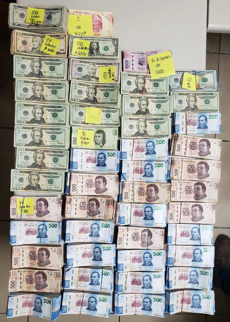 Al interior de dicho lugar, una agente del Ministerio Público, acompañada de policías de la Agencia Estatal de Investigación, peritos, elementos del grupo de reacción y agentes caninos de la Comisión Estatal de Seguridad, encontraron en una de las recamaras: cinco millones 950 mil 660 pesos en diferentes denominaciones, 16 mil 403 dólares americanos, una bolsa con marihuana y cinco envoltorios con cocaína.