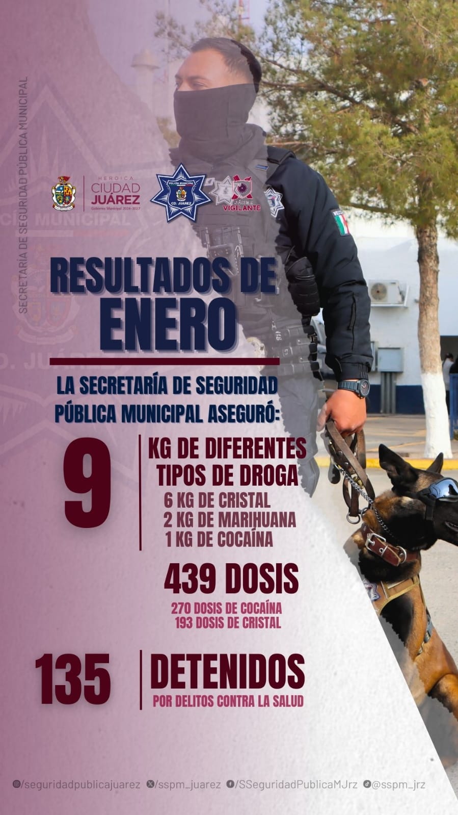 CD. JUAREZ, CHIH.- La Secretaría de Seguridad Pública Municipal informa a la ciudadanía que, durante el mes de enero del presente año, se registraron resultados favorables en el combate a los delitos contra la salud, como consecuencia de las acciones permanentes de prevención y vigilancia implementadas en distintos puntos de la ciudad.