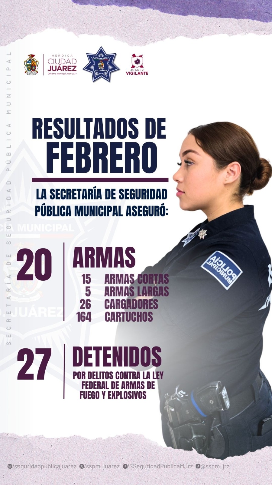 La Secretaría de Seguridad Pública Municipal refrenda su compromiso de continuar trabajando de manera firme en el combate a los delitos de alto impacto, fortaleciendo las acciones de seguridad y priorizando la protección de la ciudadanía juarense.