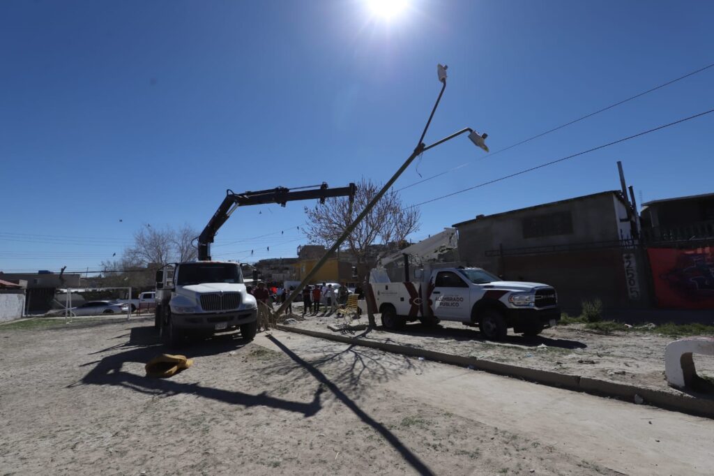 CD. JUAREZ, CHIH.- En atención a una petición realizada por el grupo de niños “Takataka”, a través de redes sociales, la Dirección de Alumbrado Público intervino un espacio ubicado en la colonia 16 de Septiembre, donde un poste de luz obstruía las actividades deportivas del grupo de jugadores de futbol del sector.