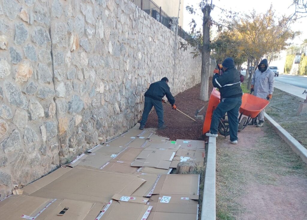 CD. JUAREZ, CHIH.- Personal de la Dirección de Parques y Jardines atiende los andadores de la calle Camino a Escudero, en el tramo de la avenida Tomás Fernández a calle Canal.