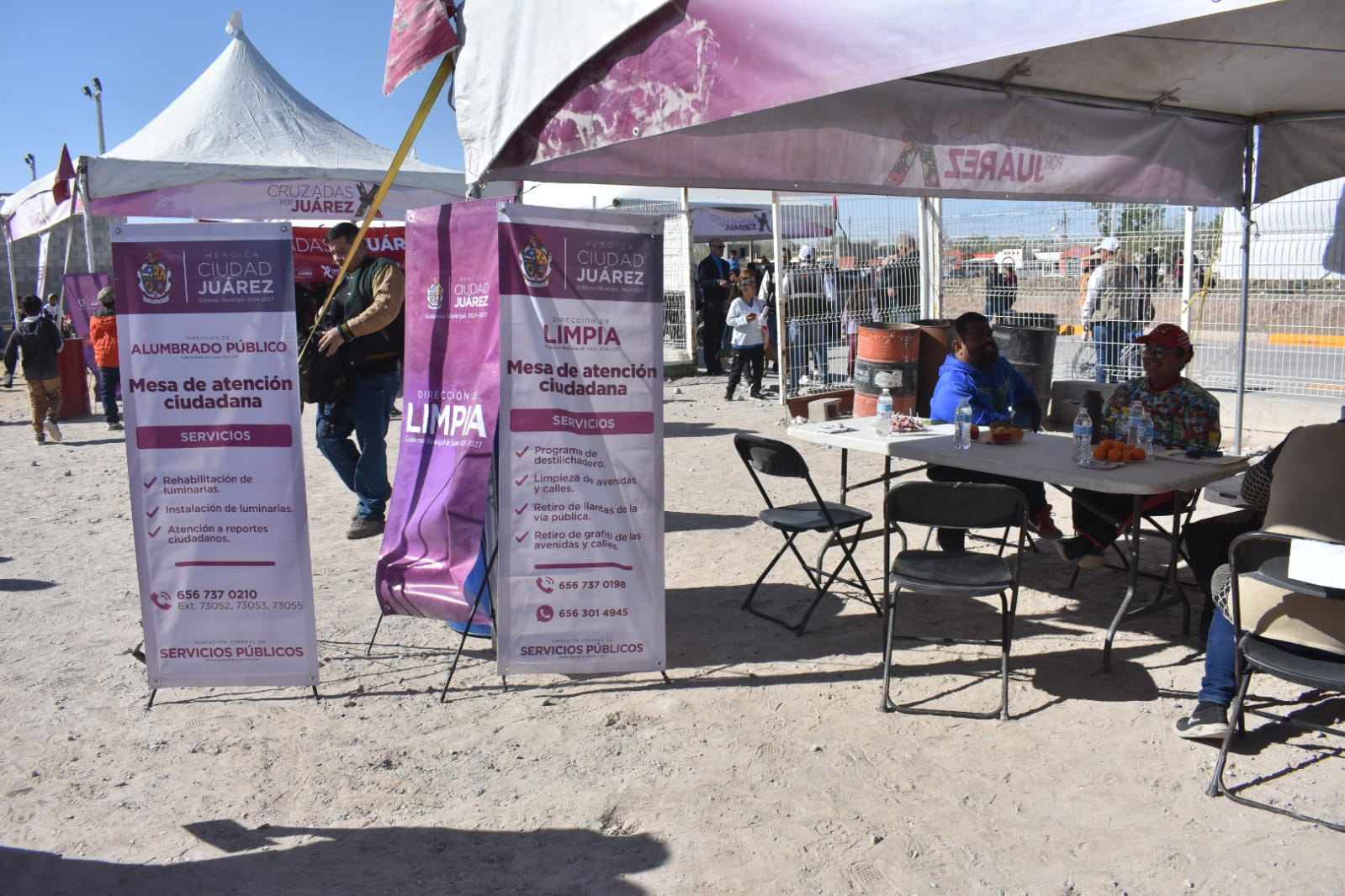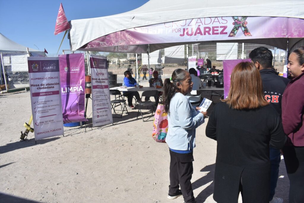 CD. JUAREZ, CHIH.- Personal de Servicios Públicos atiende peticiones de los vecinos del sector Riberas del Bravo en los módulos instalados en el centro comunitario ubicado sobre la calle Rivera de Mitla, con motivo del evento «Cruzadas por Juárez, Atención a las Causas, Ciudad Juárez por la Paz”.