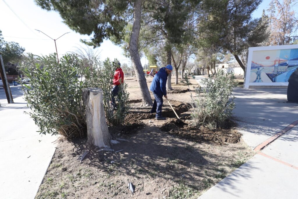 CD. JUAREZ, CHIH.-Con el fin de que las familias juarenses cuenten con espacios verdes más agradables y en mejores condiciones para la convivencia, personal de la Dirección de Parques y Jardines realiza trabajos de reforestación y mantenimiento en el Parque Borunda.