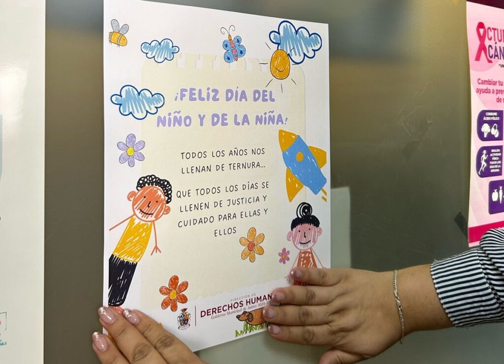 CD. JUAREZ, CHIH.- En el marco de las actividades del mes de abril, dedicado a la niñez, personal de la Dirección de Derechos Humanos colocó carteles informativos en el edificio de la Unidad Administrativa “Lic. Benito Juárez” (presidencia municipal), con el objetivo de visibilizar y promover los derechos de niñas y niños.