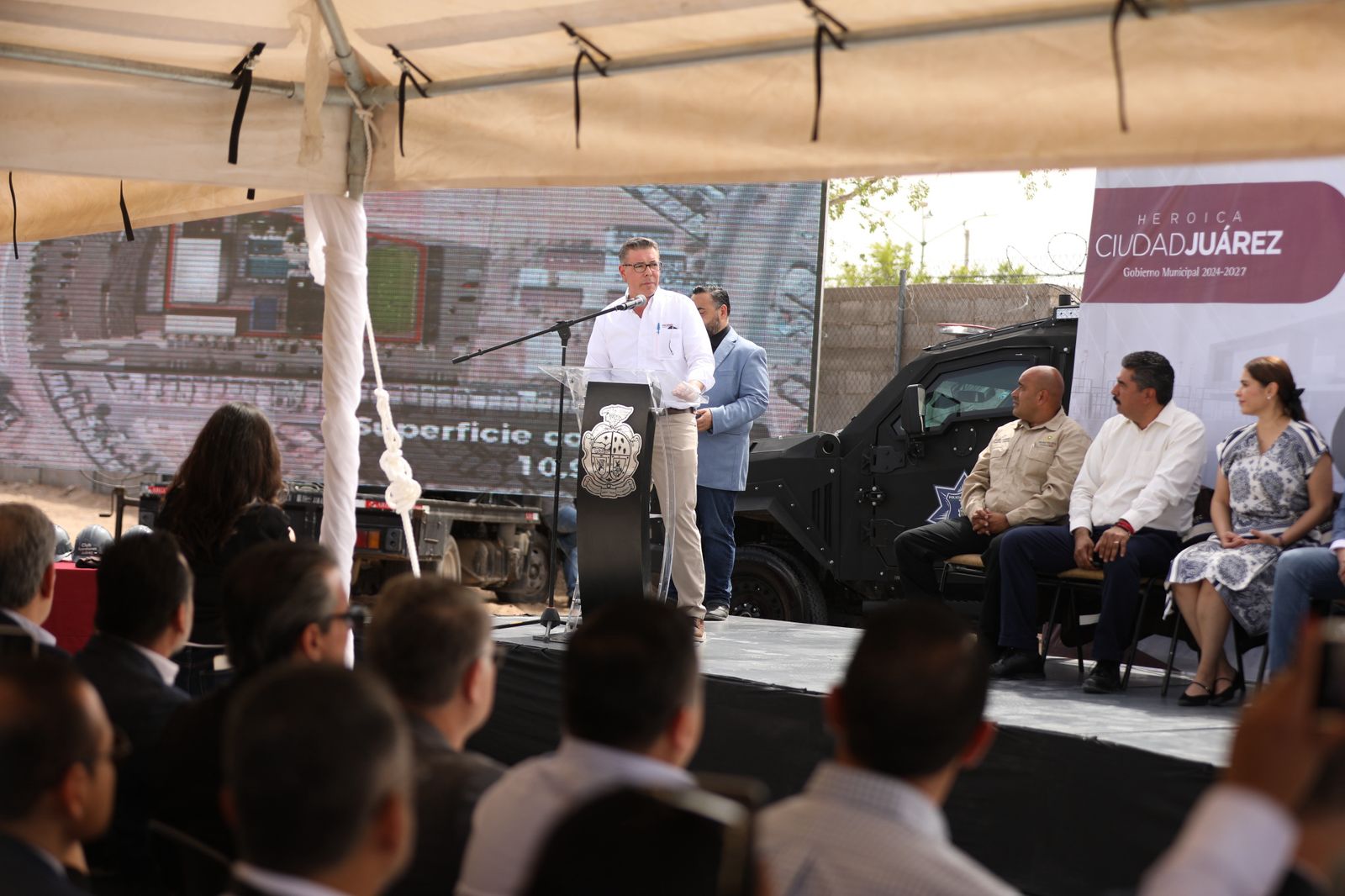 CD. JUAREZ, CHIH.- Este mediodía, el Presidente Municipal, Cruz Pérez Cuéllar, acompañado de su esposa y presidenta del Sistema para el Desarrollo Integral de la Familia del Municipio (DIF), Rubí Enríquez, llevó a cabo la colocación de la primera piedra del Parque de Policías Club Guardianes Juárez.