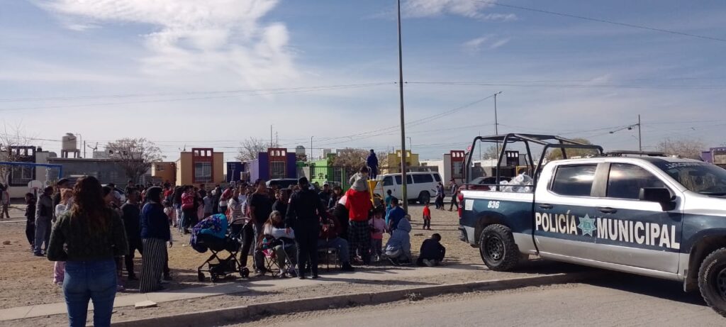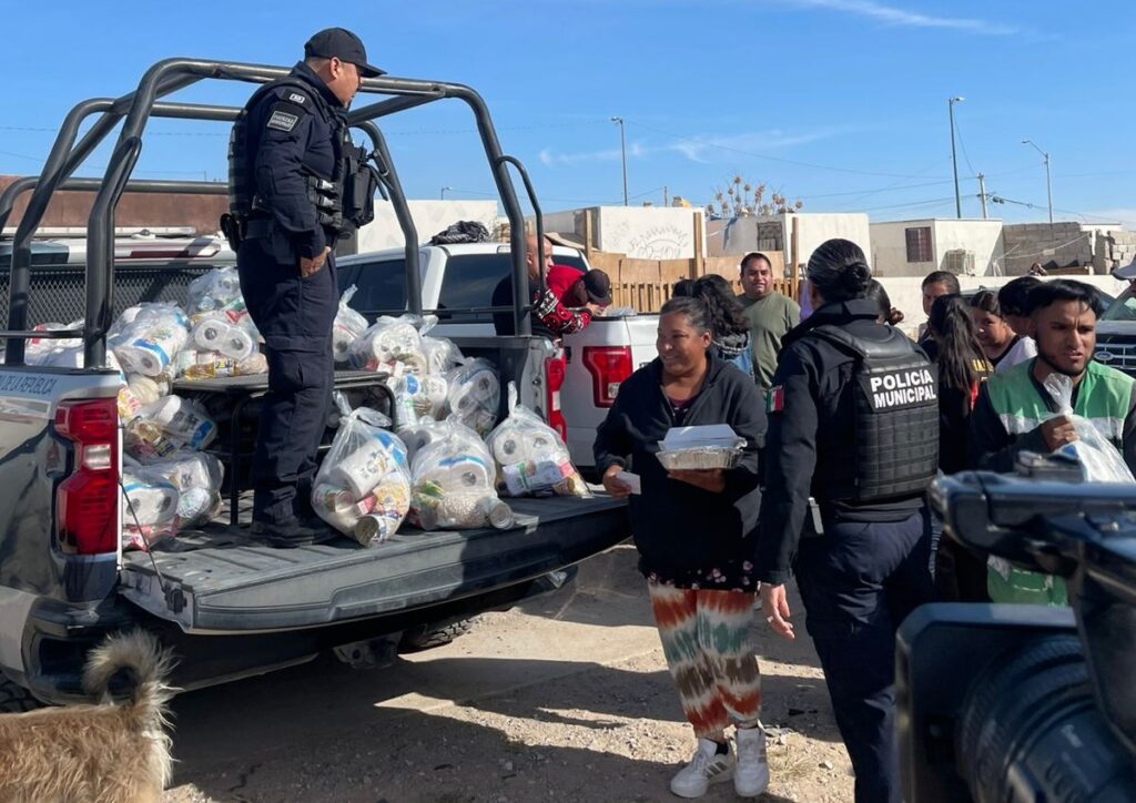 CD. JUAREZ, CHIH.- La Secretaría de Seguridad Pública Municipal, a través de la Dirección Operativa de Prevención Social, y en coordinación con la asociación civil Ayuda con el Corazón en la Mano y Seguridad Privada de las Américas, llevó a cabo una actividad comunitaria consistente en la entrega de despensas, juguetes y una cena navideña en beneficio de habitantes de la colonia Valle de Allende.