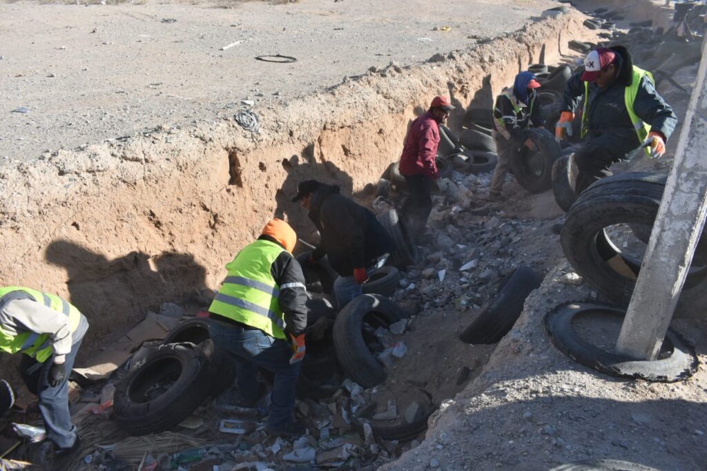 CD. JUAREZ, CHIH.- Personal de la Dirección de Limpia continúa trabajando este sábado en el retiro de llantas, basura y escombro de un predio baldío ubicado sobre el cruce del bulevar Manuel Talamás Camandarí y San Isidro, dio a conocer Gibran Solís Kanahan, titular de la dependencia.