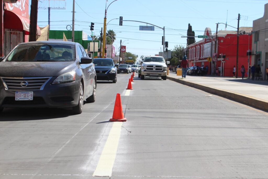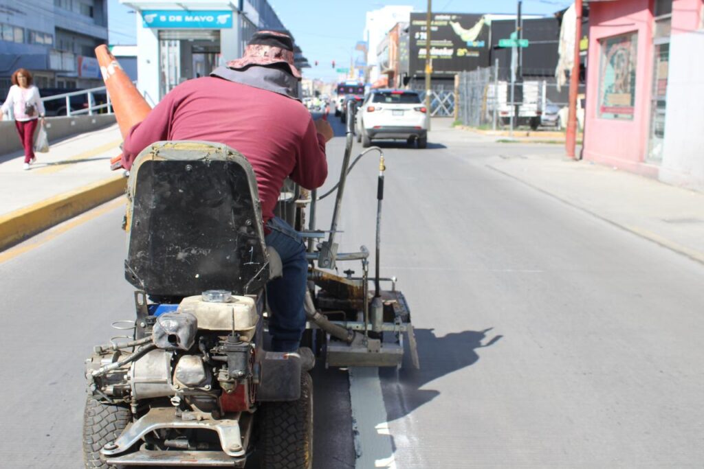 CD. JUAREZ, CHIH.- Personal de Control de Tráfico de la Coordinación General de Seguridad Vial, continúa pintando las líneas para la división de carriles de circulación vehicular en la avenida 16 de Septiembre, de la calle Bolivia a la calle Ramón Corona.