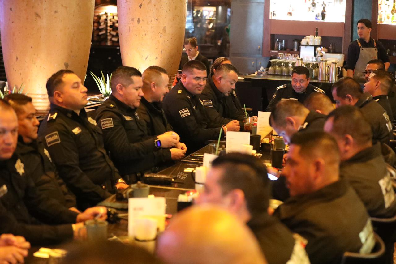 CD. JUAREZ, CHIH.- Directivos de la Confederación Patronal de la República Mexicana (COPARMEX), ofrecieron un brindis con mandos de la Secretaría de Seguridad Pública Municipal (SSPM), en agradecimiento por el esfuerzo que hacen por mantener la seguridad en las calles, por arriesgar sus vidas por el bien de los ciudadanos y para desearles lo mejor para ellos y sus familias en estas fiestas decembrinas.