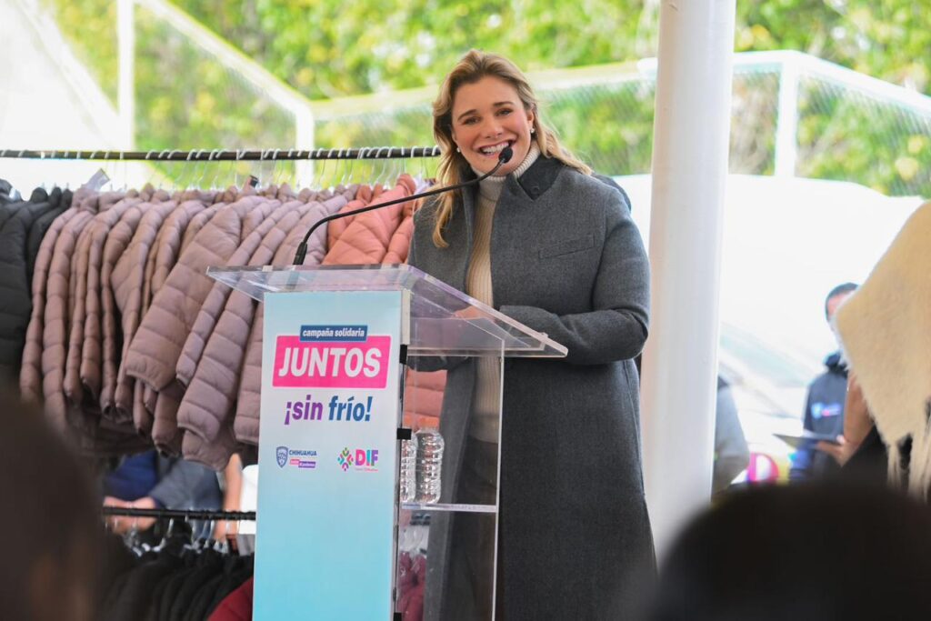 En su mensaje, Maru Campos se dirigió a la niñez presente, a quienes dijo que las chamarras que están recibiendo provienen del apoyo de personas de Juárez, Delicias, Camargo, Cuauhtémoc, entre otras ciudades, así como de funcionarios del Gobierno del Estado, como una muestra de que no están solas ni solos.