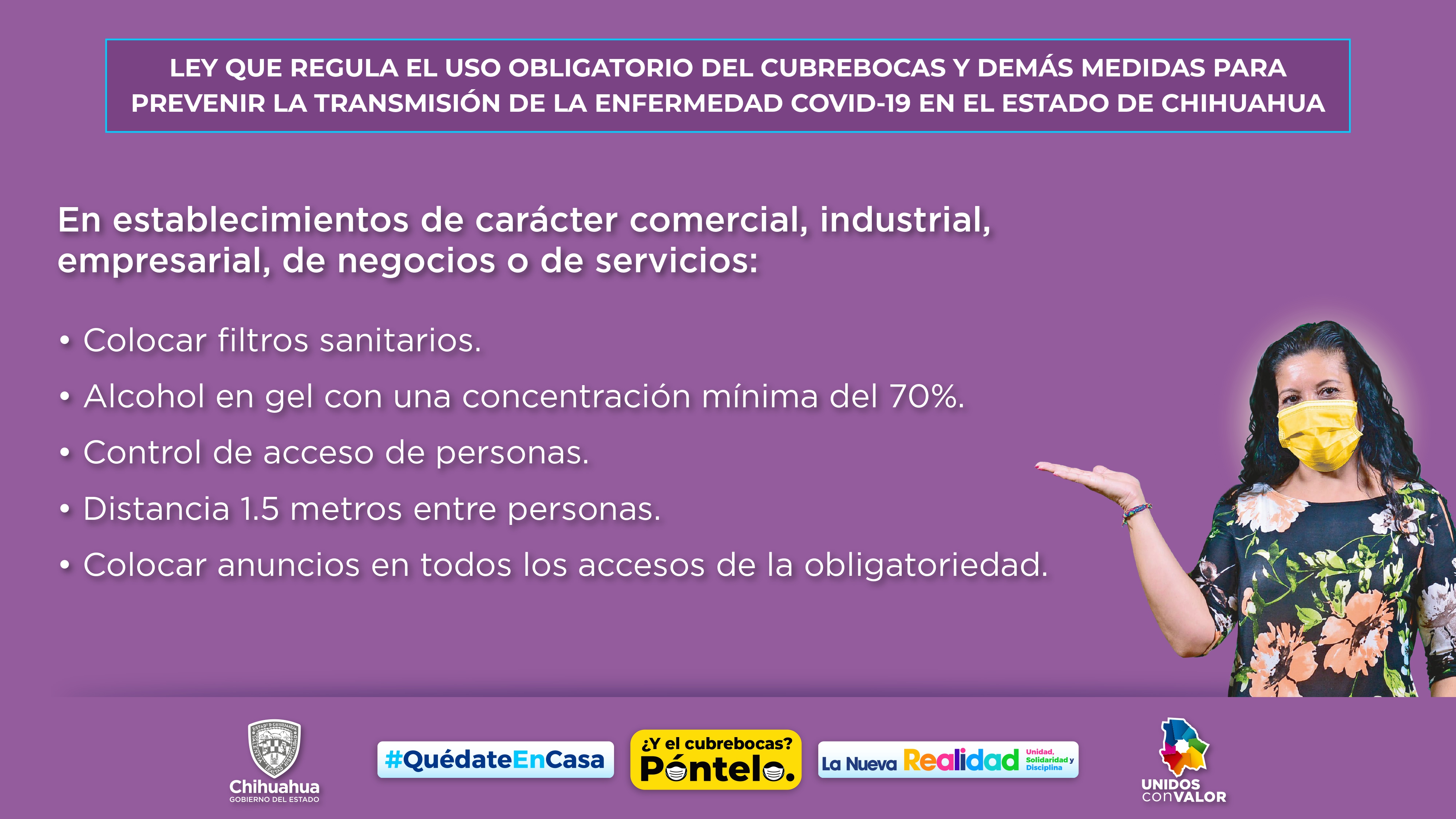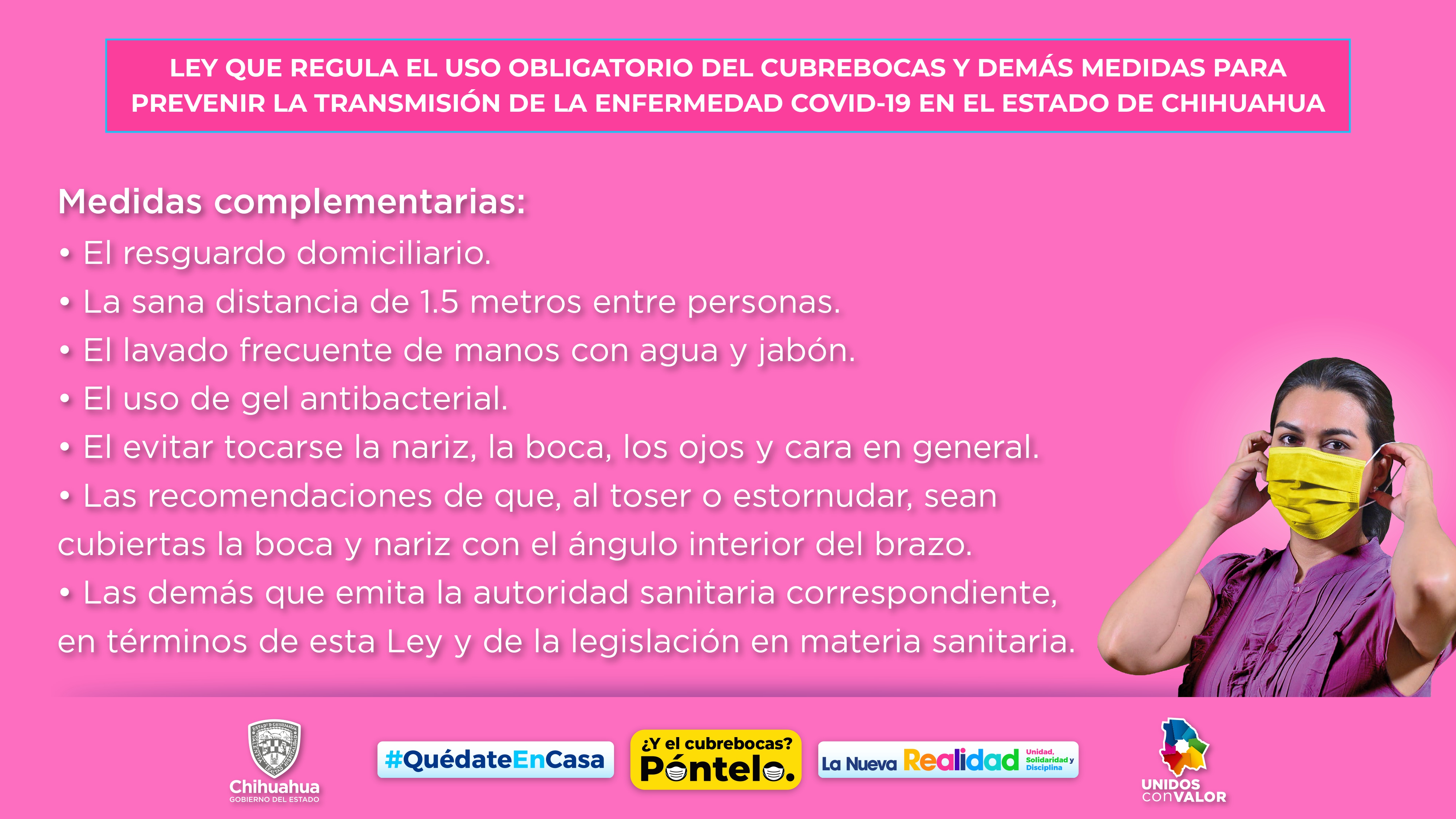 Esta normatividad contempla no únicamente el uso del cubrebocas, sino el acatar el resto de las medidas preventivas establecidas por el Sector Salud, a fin de reducir el índice de contagio de la pandemia. “Es deber de ciudadanos solidarios protegernos y proteger a los demás”. “Esto es lo que nos va a ayudar también a ese equilibrio entre la economía y la salud”, aseguró la doctora Mirna Beltrán, subsecretaria de Prevención y Promoción de la Salud.