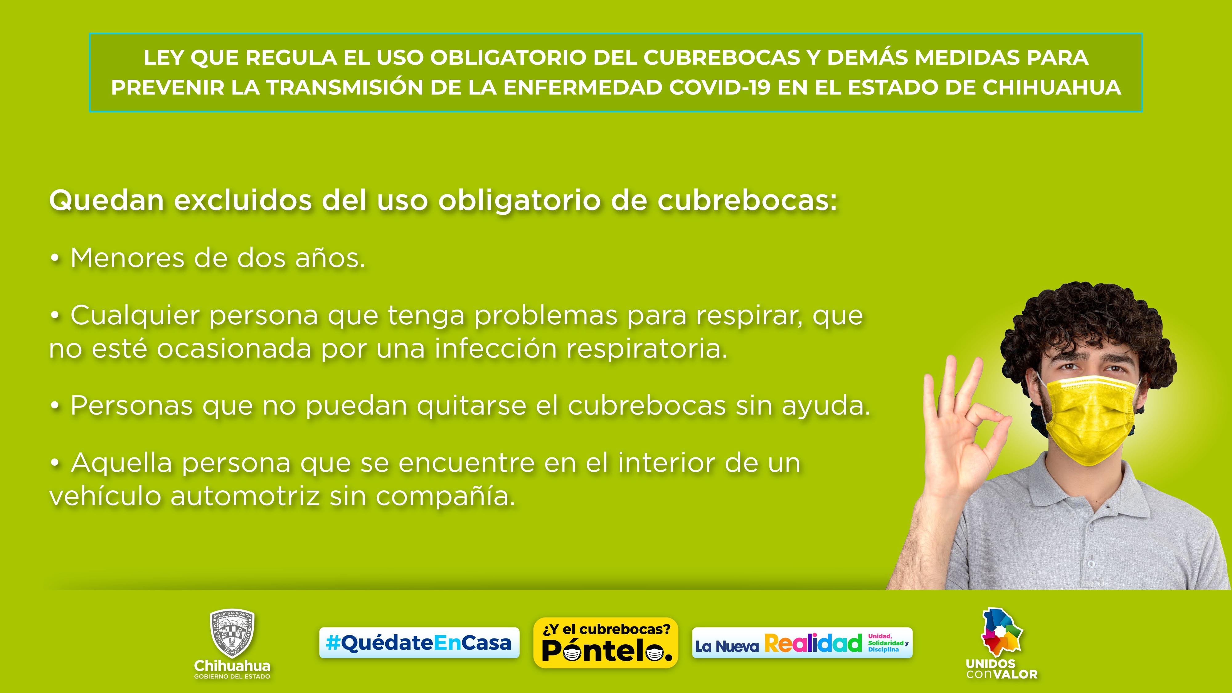 Quedan excluidos del uso obligatorio, las y los menores de dos años, así como quienes no puedan quitarse el cubrebocas sin ayuda, y las personas que se encuentren en el interior de un vehículo automotriz sin compañía, ya que si va alguien más, ya sea enseguida o en la parte de atrás del vehículo, ambas deberán portarlo, puntualizó.