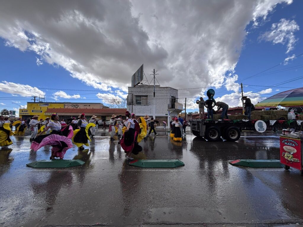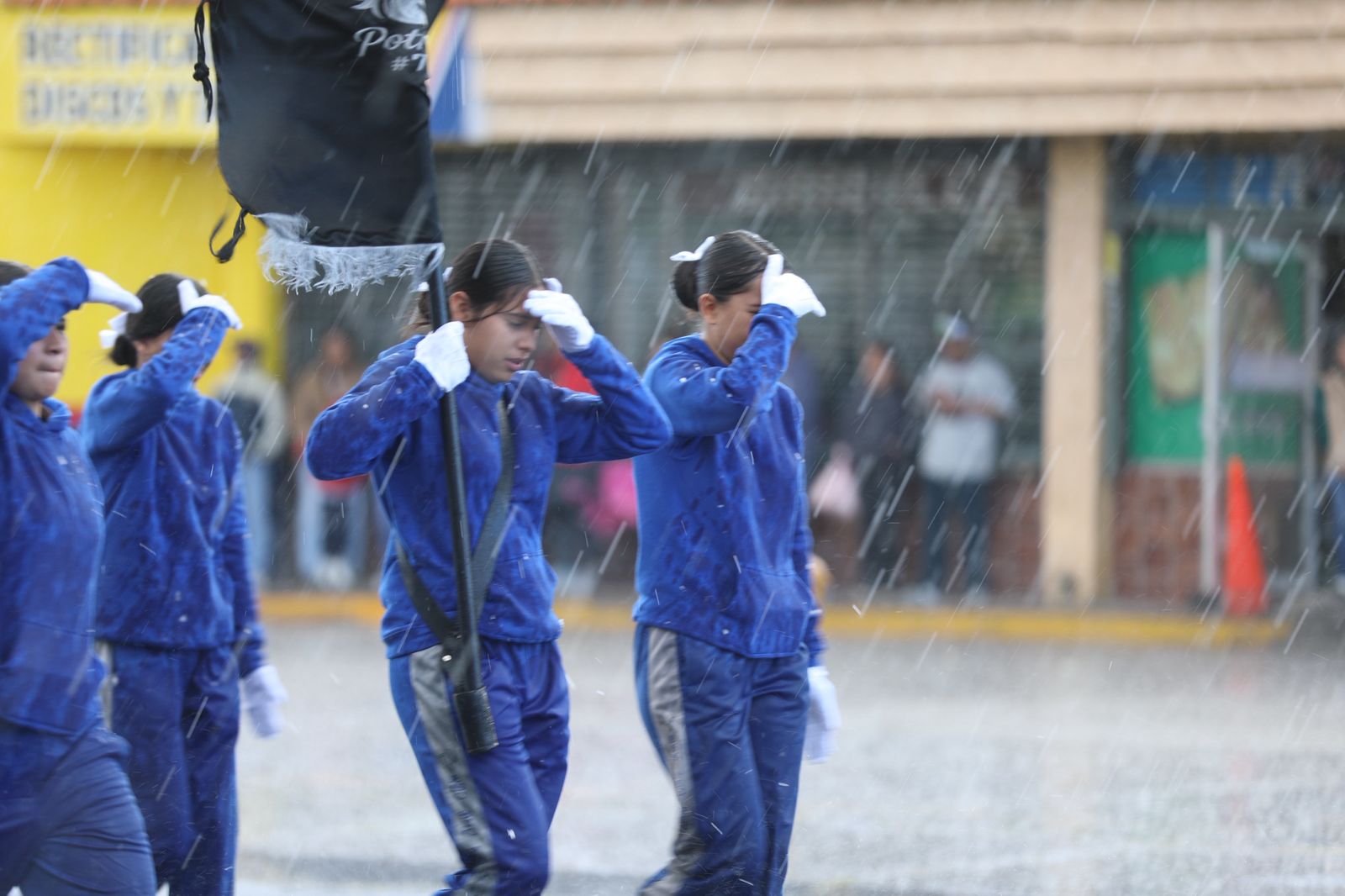 A pesar de que durante algunos minutos cayó granizo, el desfile no se detuvo y los contingentes continuaron avanzando, mostrando disciplina y entusiasmo, lo que generó un ambiente de convivencia que se mantuvo hasta el final.
