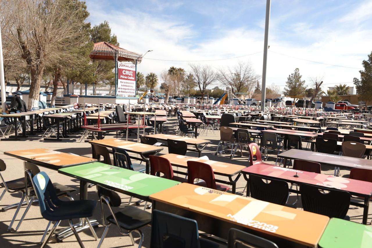 CD. AHUMADA, CHIH.- Como parte de su gira de en varios municipios del estado, el Presidente Municipal, Cruz Pérez Cuellar en coordinación con la Asociación Más por Chihuahua, donó mobiliario escolar a Ahumada.