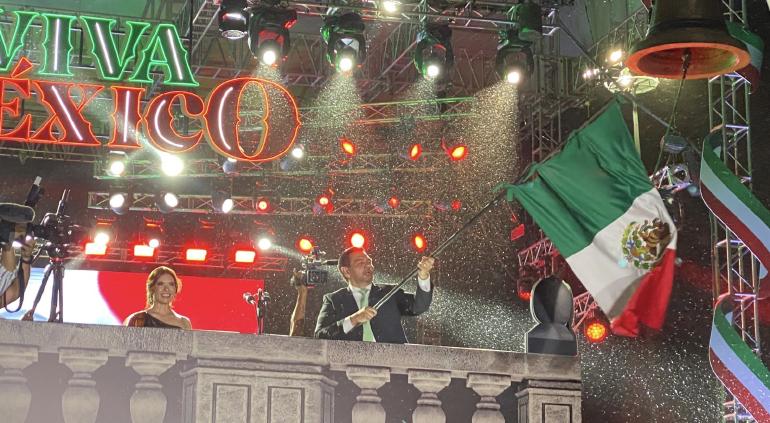 Recibió de manos de la escolta la Bandera de México para ondearla, posteriormente sonó la campana y dio el Grito de Independencia.