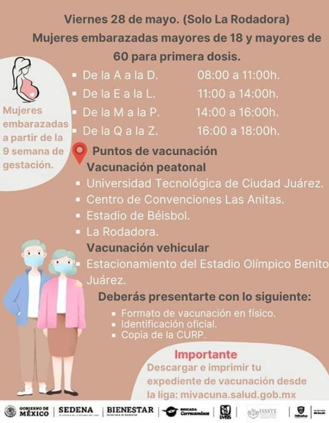 Se les recuerda a las personas llevar el formato que se encuentra en la página de Internet de www.mivacuna.salud.gob.mx/index.php que se debe “bajar”, imprimir y llenar; una identificación oficial con fotografía, copia de la CURP y el comprobante de domicilio que acredite que vive en el municipio de Chihuahua.