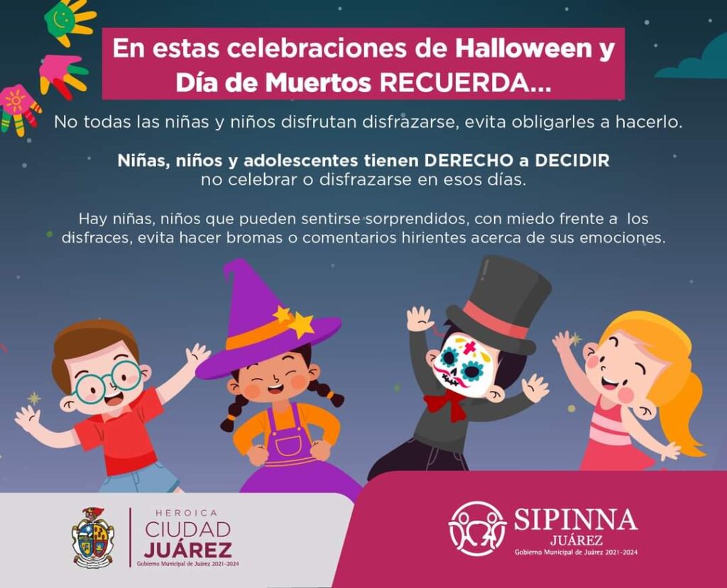 CD. JUAREZ, CHIH.- El Sistema Municipal de Protección Integral de Niñas, Niños y Adolescentes (SIPINNA), emite algunas recomendaciones para los festejos del día de Halloween que serán el próximo martes.