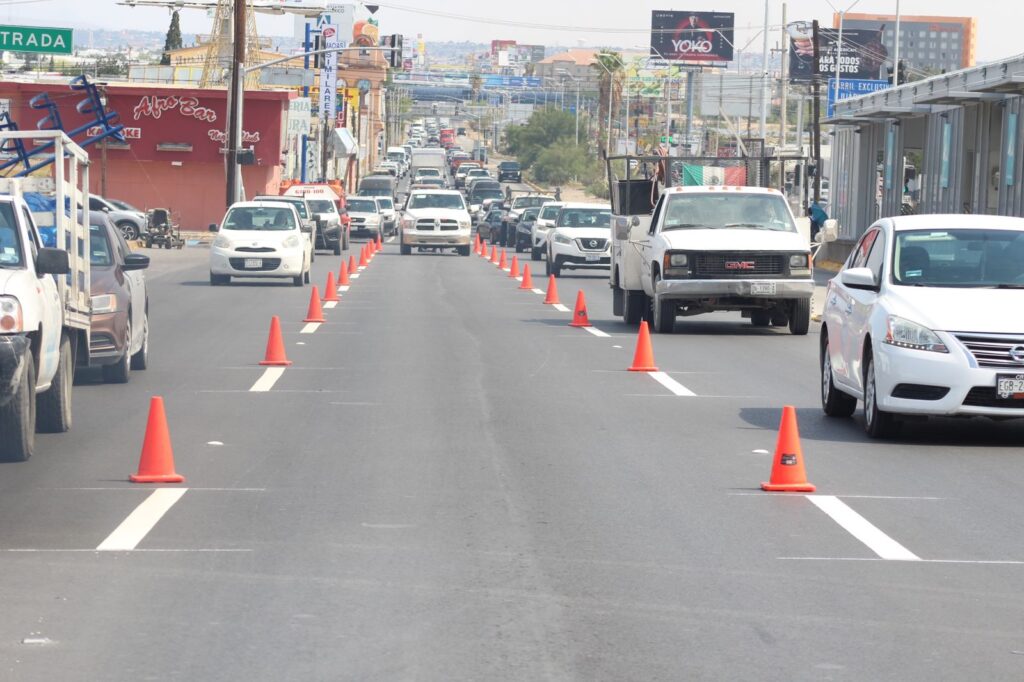 Estas vialidades ya cuentan con pintura termoplástica que se aplicó para la división de carriles, así como los trabajos de pintura para pasos peatonales, la colocación de vialetas autoadheribles y estoperoles que se colocan para complementar los trabajos y garantizar un mejor flujo vehicular.