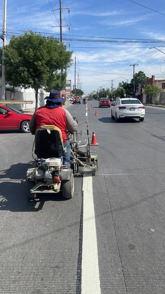 CD. JUAREZ, CHIH.- Desde el 11 de julio del 2022 que se puso en marcha el programa Cruzada por la Mejora Vial, se ha aplicado pintura termoplástica en más de 210 mil metros para pintar las líneas que delimitan los carriles de circulación vehicular en distintas avenidas de la ciudad.