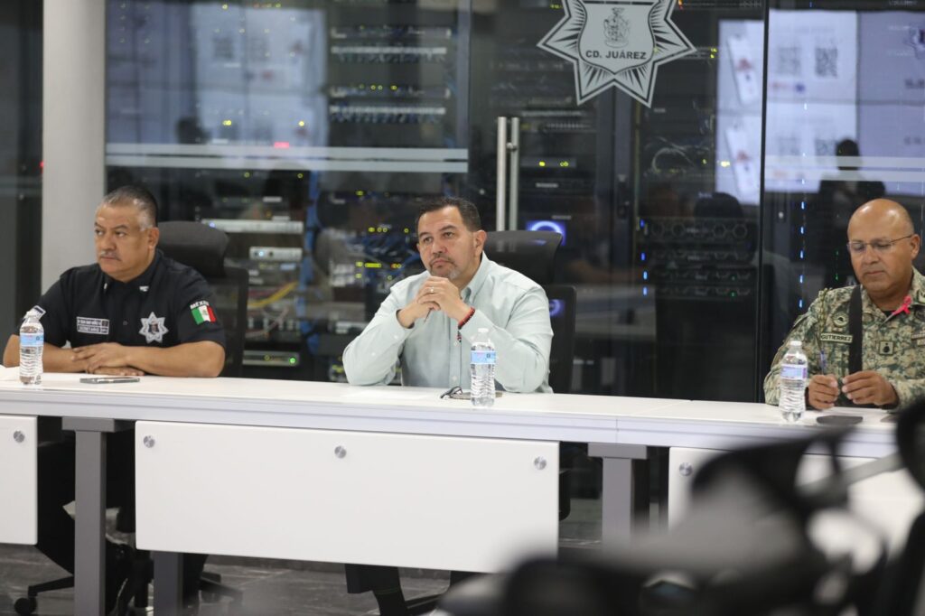 CD. JUAREZ, CHIH.- El Presidente Municipal, Cruz Pérez Cuéllar, en coordinación con las diferentes corporaciones de seguridad de los tres órdenes de Gobierno, encabezó la reunión de la Mesa de Coordinación para la Construcción de la Paz, la cual se llevó a cabo en el Centro de Emergencia y Respuesta Inmediata de la Secretaría de Seguridad Pública Municipal.