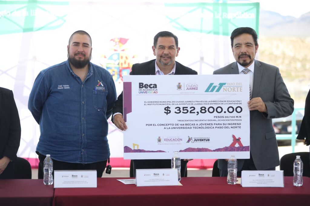 CD. JUAREZ, CHIH.- Como parte de las acciones que lleva a cabo el Gobierno Municipal en apoyo a la educación pública, este día el Presidente Cruz Pérez Cuéllar entregó 168 becas de acceso a la Universidad Tecnológica Paso del Norte (UTPN).