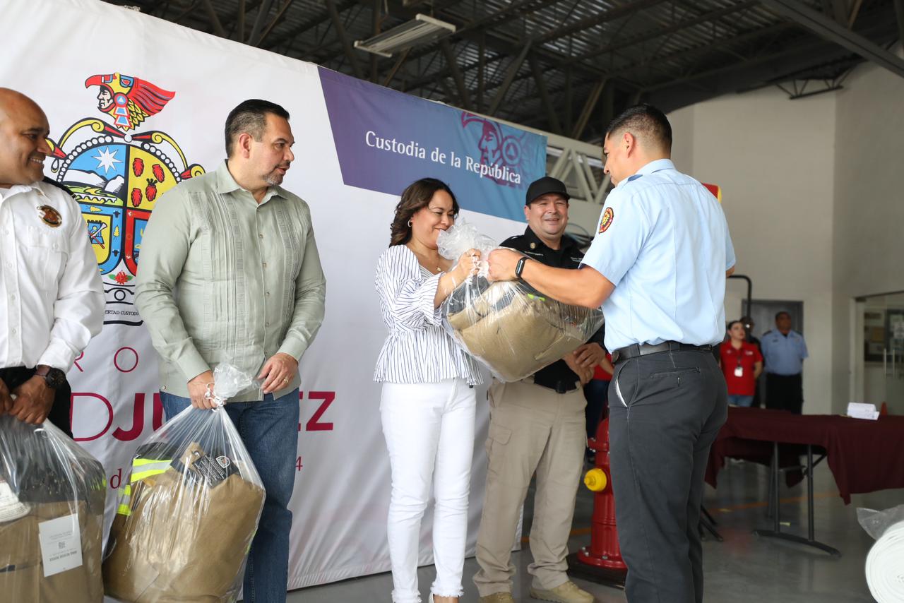 La entrega de uniformes incluyó a los 54 elementos de Rescate Municipal, quienes recibieron pantalón táctico, playera polo, camisa de placas, chalecos, entre otras prendas, así como 200 uniformes a los bomberos, que además recibieron 47 equipos completos para la atención de incendios.