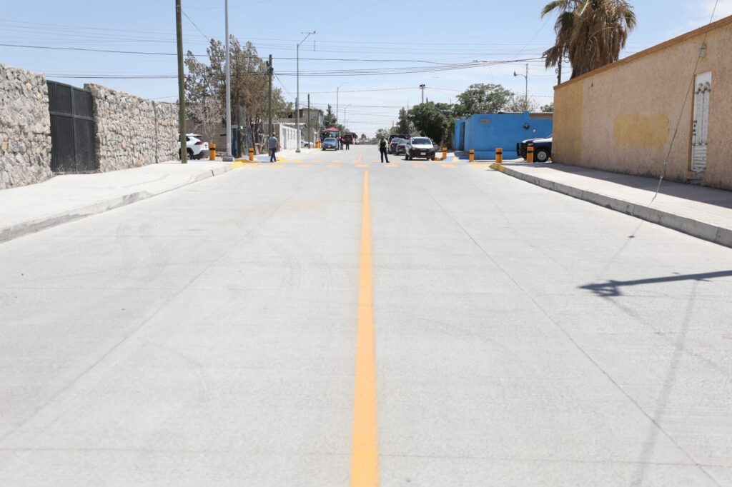 CD. JUAREZ, CHIH.- El Presidente Municipal, Cruz Pérez Cuéllar, hizo entrega de las obras de pavimentación de las calles Fresa y Aceituna Negra a los vecinos de la colonia El Granjero.