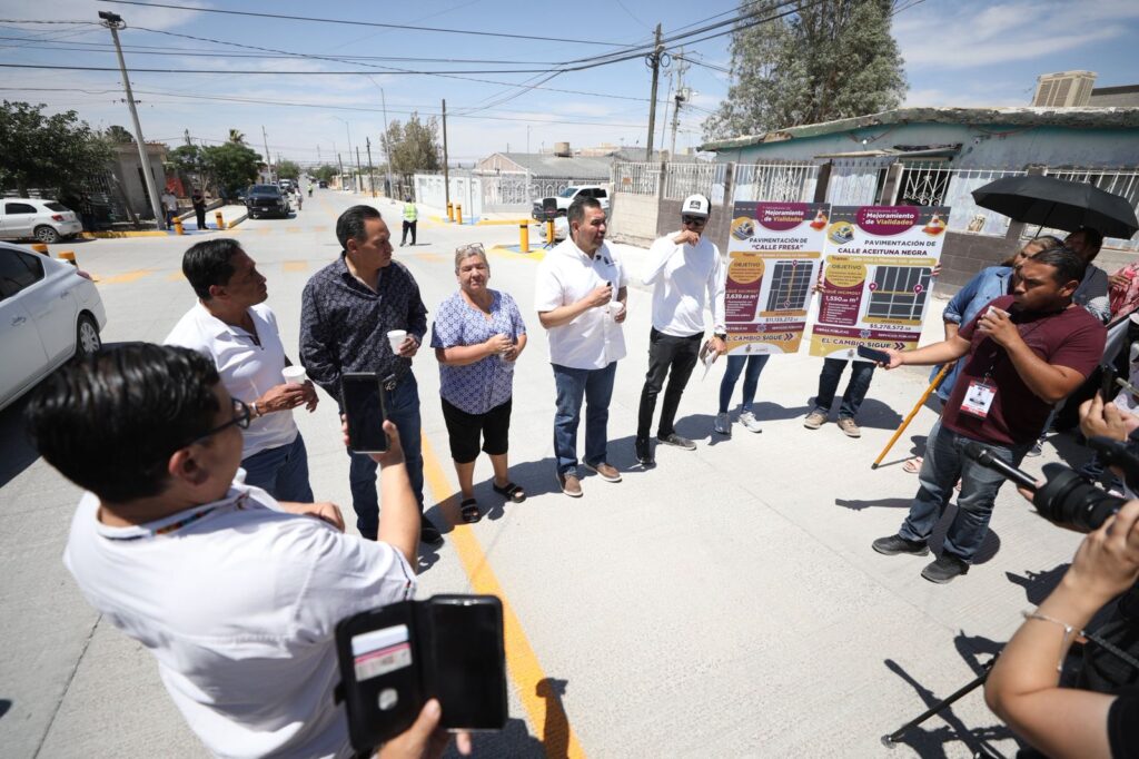 CD. JUAREZ, CHIH.- El Presidente Municipal, Cruz Pérez Cuéllar, hizo entrega de las obras de pavimentación de las calles Fresa y Aceituna Negra a los vecinos de la colonia El Granjero.