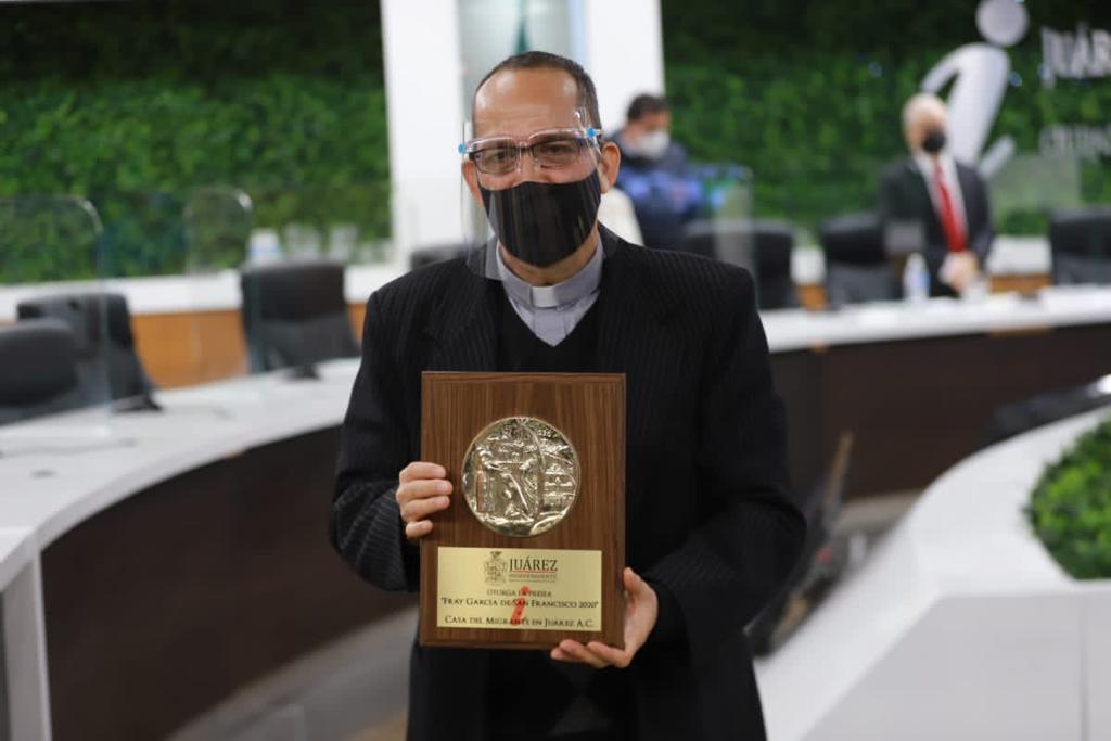 CD. JUAREZ, CHIH.-El Presidente Municipal Armando Cabada Alvídrez, encabezó la Sesión 92 Solemne de Cabildo, donde se llevó a cabo la entrega de la Presea Fray García de San Francisco a la Casa del Migrante en Juárez Asociación Civil, dirigida por el padre Javier Calvillo, en el marco de los festejos por el 361 Aniversario de la Fundación de Ciudad Juárez.