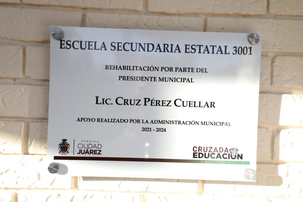 CD. JUAREZ, CHIH.– Este día, el Presidente Municipal, Cruz Pérez Cuéllar, entregó la rehabilitación de la escuela Secundaria Estatal #3001, ubicada en la avenida Vicente Guerrero y Ramón Corona.