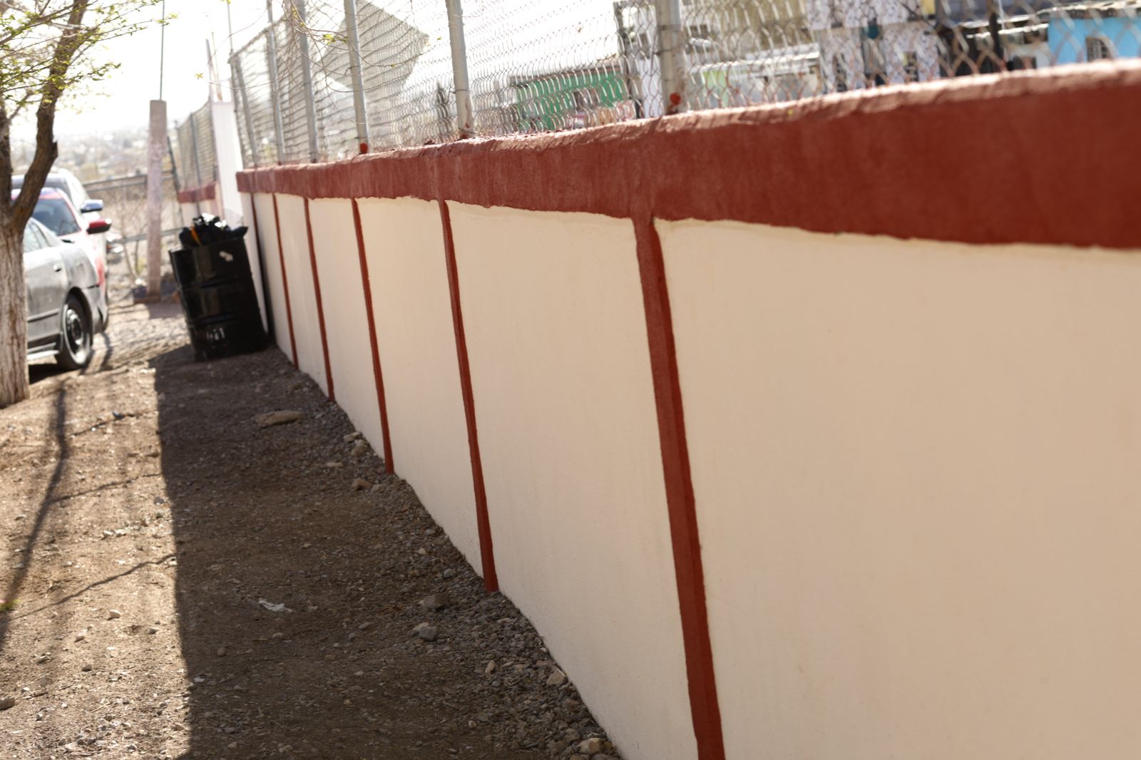 Los trabajos realizados incluyeron resane y pintura exterior en aulas, pintura en herrería general, colocación de señalamientos y guarniciones, así como la construcción de 90 metros lineales de muro de 1.4 metros de altura con 1 metro de malla ciclónica.