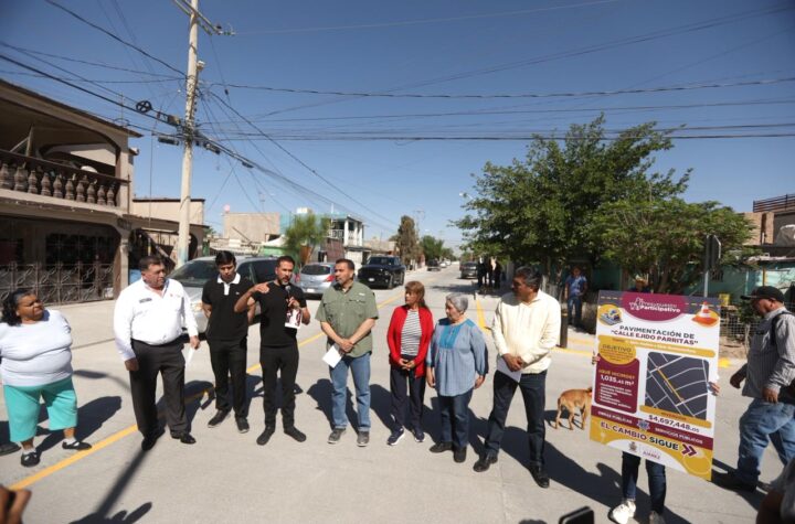 CD. JUAREZ, CHIH.- El Presidente Municipal, Cruz Pérez Cuéllar, encabezó este día la entrega de la pavimentación de la calle Irving Flores, obra realizada a través del esquema de Presupuesto Participativo y que beneficiará directamente a residentes del sector.