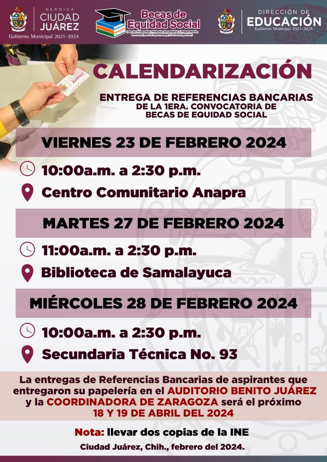La Dirección de Educación informó que el 23 de febrero se hará entrega de referencias bancarias en el Centro Comunitario Anapra, en horario de 10:00 de la mañana a 2:30 de la tarde.