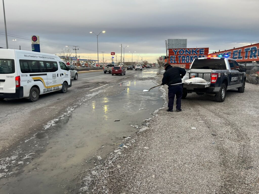 CD. JUAREZ, CHIH.- Con la finalidad de evitar cualquier tipo de incidentes, agentes de la Coordinación General de Seguridad Vial, esparcieron sal sobre vialidades que presentaban hielo y a su vez representan peligro tanto para conductores como peatones.
