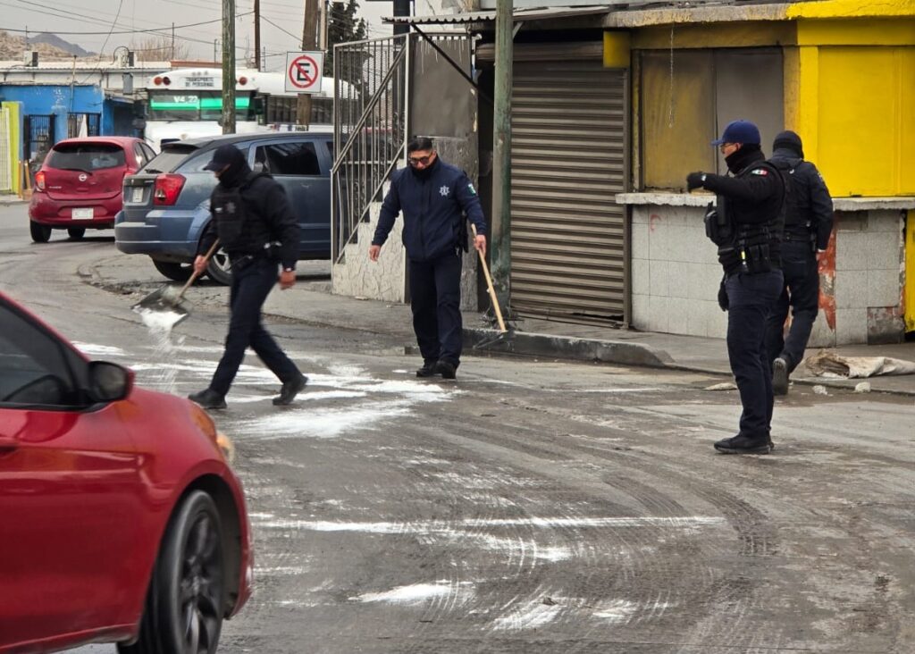 CD. JUAREZ, CHIH.- Con la finalidad de evitar cualquier tipo de incidentes, agentes de la Coordinación General de Seguridad Vial, esparcieron sal sobre vialidades que presentaban hielo y a su vez representan peligro tanto para conductores como peatones.