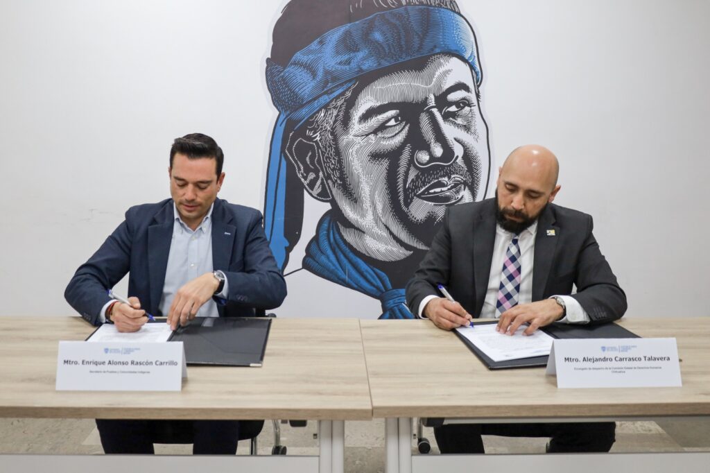 La firma del documento fue encabezada por el secretario de Pueblos y Comunidades Indígenas, Enrique Rascón, y el encargado del despacho de la CEDH, Alejandro Carrasco.