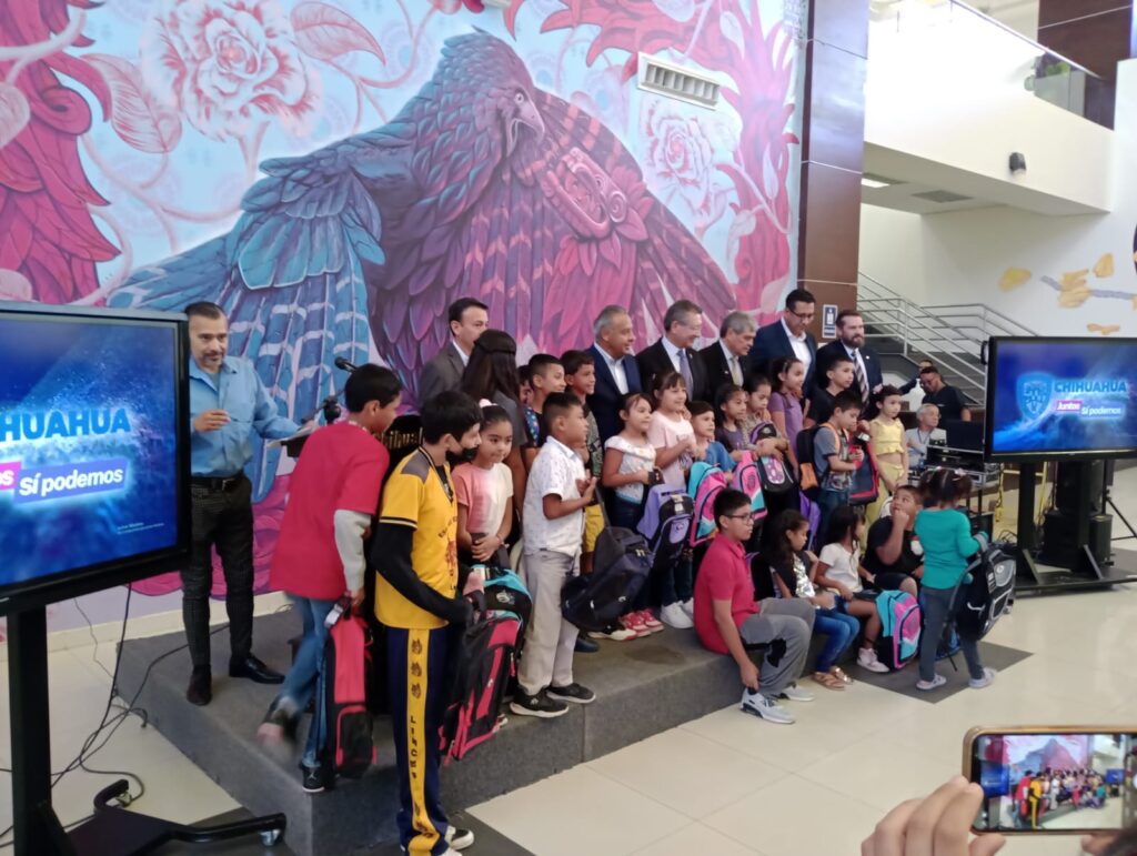 CD. JUAREZ, CHIH.- Esta mañana autoridades estatales hicieron entrega de 403 mochilas, equipadas con útiles escolares a niños y niñas de diferentes escuelas preescolares y primarias de alumnos migrantes.
