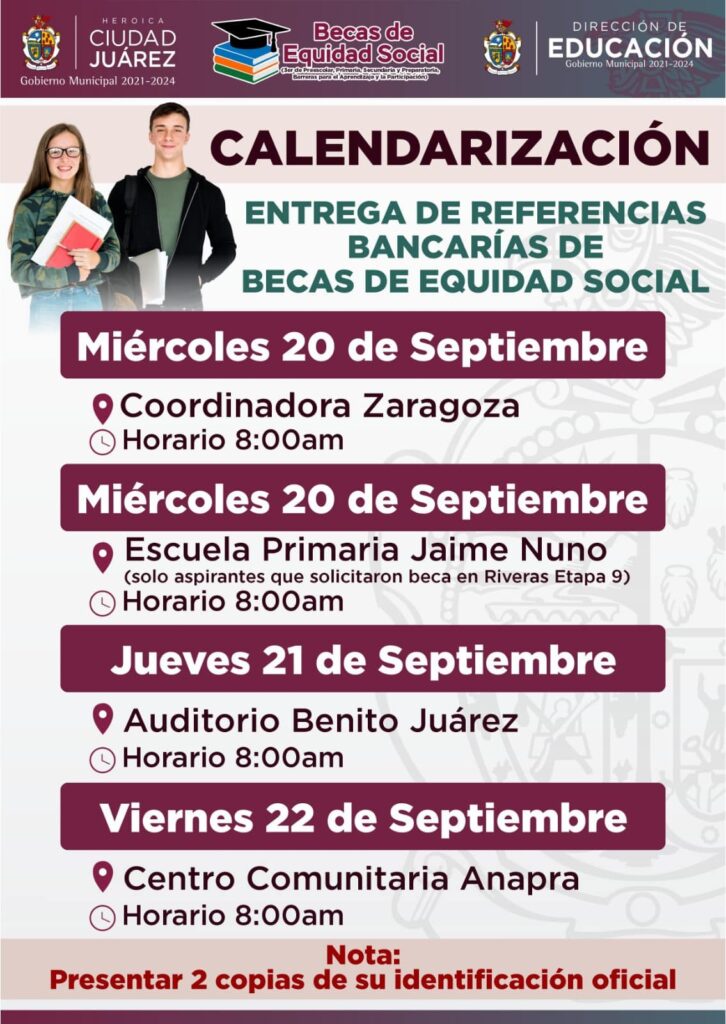 El jueves 21 de septiembre se entregarán las becas escolares en el Auditorio Municipal Benito Juárez, a partir de las 8:00 de la mañana y el viernes 22 de septiembre concluirá la entrega en el Centro Comunitario Anapra, a la misma hora.